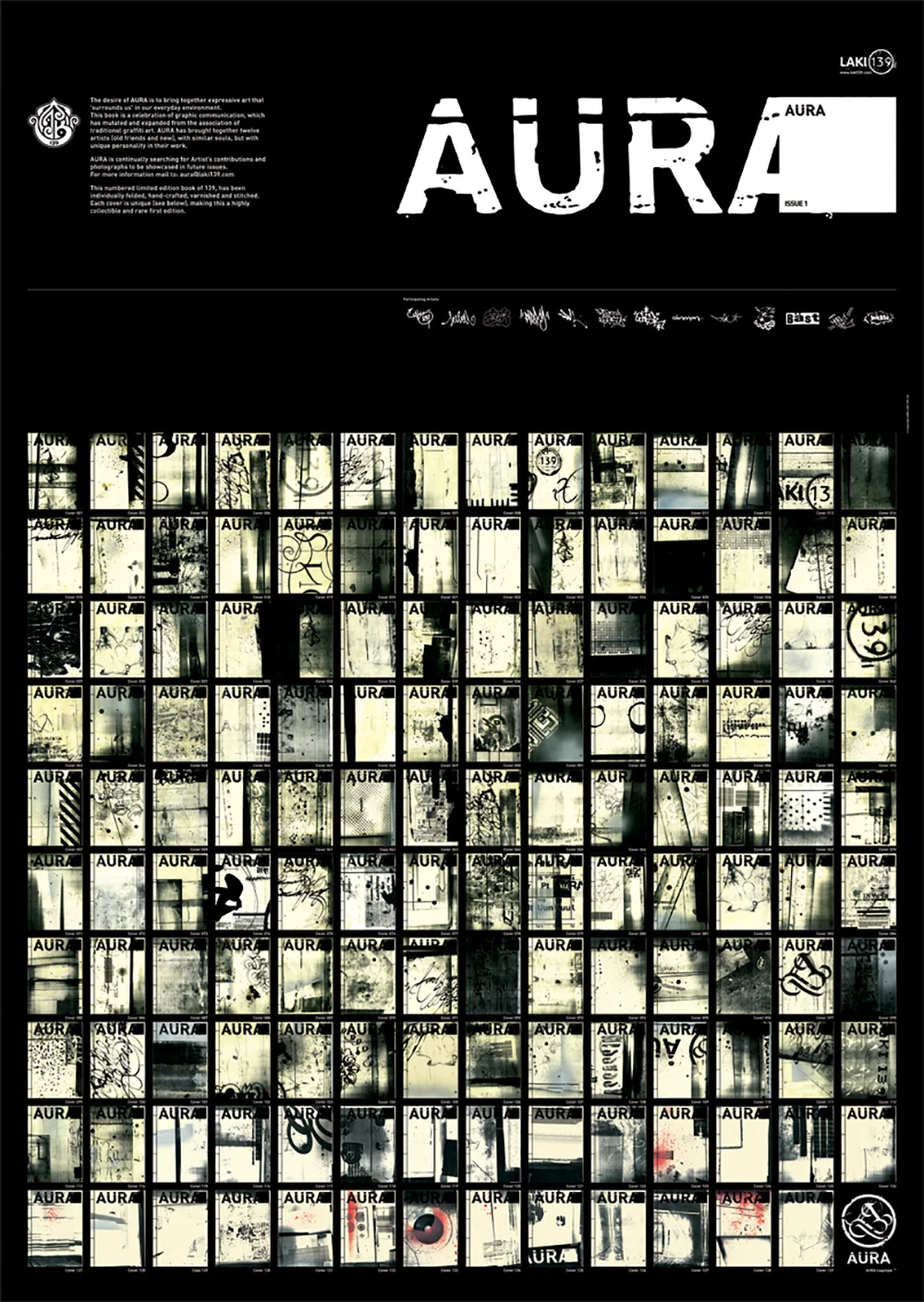 AURA_1 brought together twelve artists (old friends and new), with similar souls, but with unique personality in their work. This numbered limited edition book of 139, has been individually folded, hand-crafted, varnished and stitched. Each cover is unique, making this a highly collectible and rare first edition.